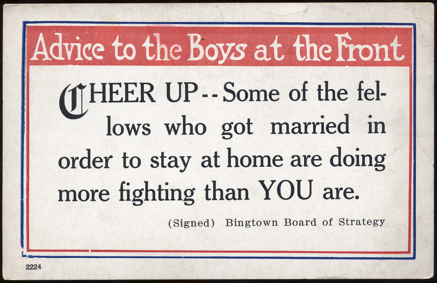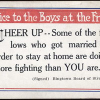 - This postcard has a printed message entitled "Advice to the Boys at the Front". Text reads: "Cheer up--Some of the fellows who got married in order to stay at home are doing more fighting than YOU are. (Signed) Bingtown Board of Strategy". In lower left corner is a number: 2224. On reverse: blank.