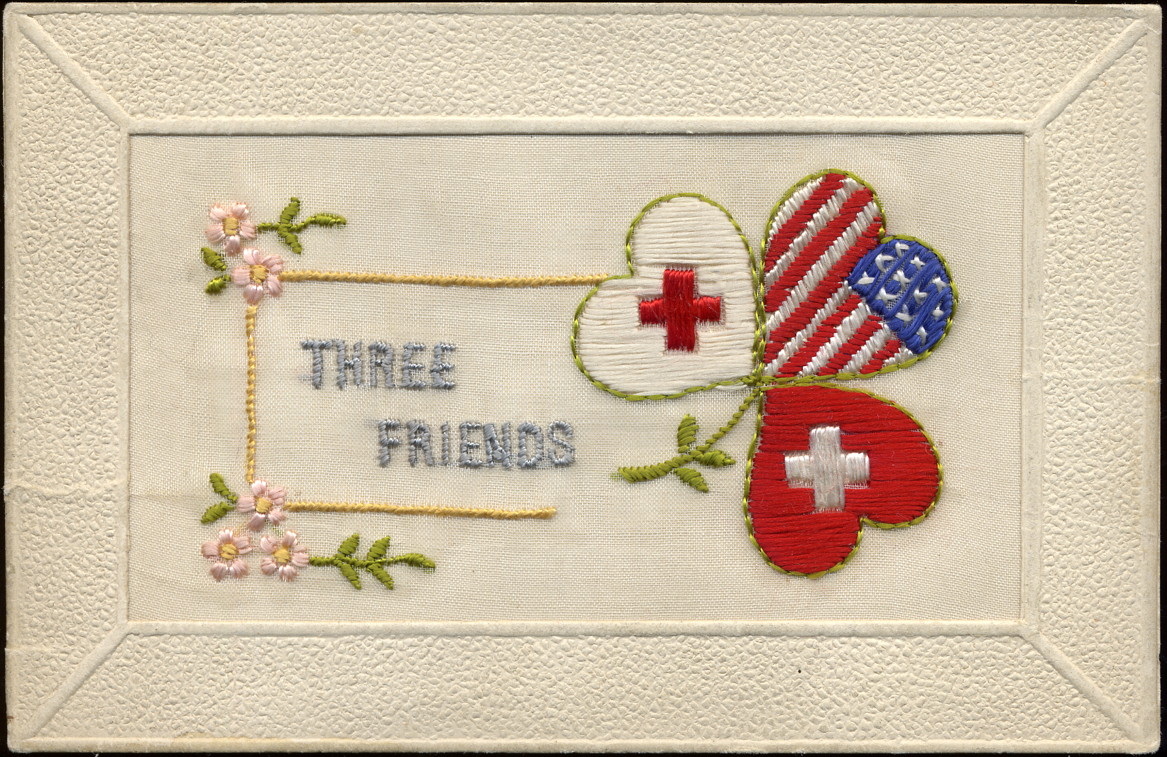 - The phrase "Three Friends" is embroidered alongside a three-leaf clover. Each leaf has an embroidered image: a red cross on white, an American flag, and a white cross on red. On reverse: blank.