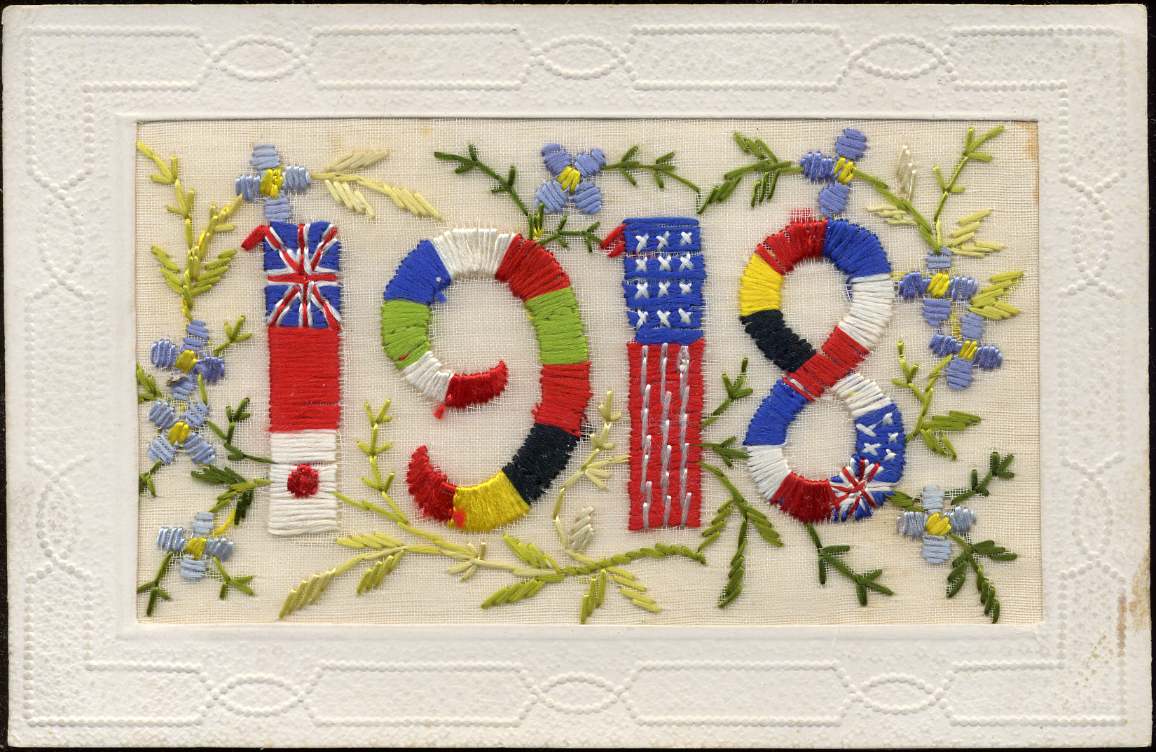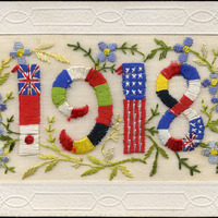 This postcard has "1918" embroidered with different flags and surrounded by embroidered flowers. On reverse: handwritten message.