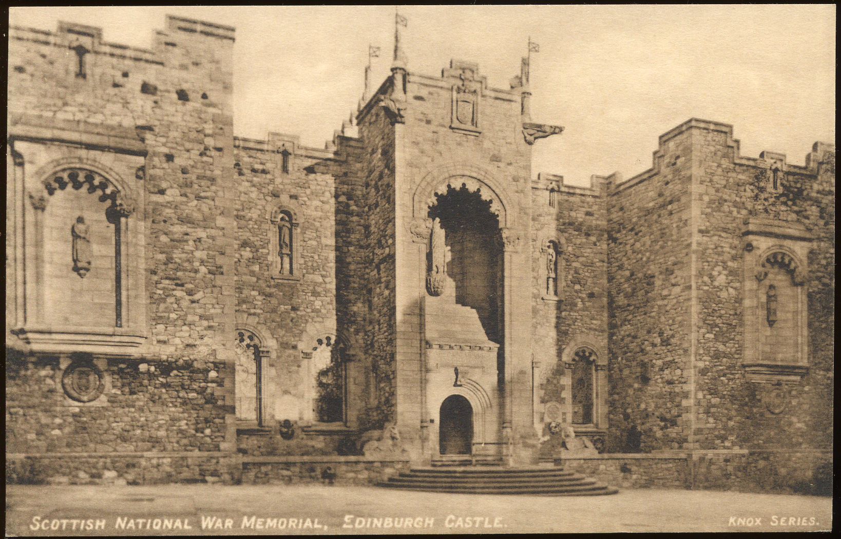 - This postcard is a sepia-toned photo of Edinburgh Castle. Text at bottom left: "Scottish National War Memorial, Edinburgh Castle". At bottom right: "Knox Series." On reverse: "Printed in Edinburgh"; "Published by W.J. Hay John Knox's HO. Edinb".