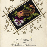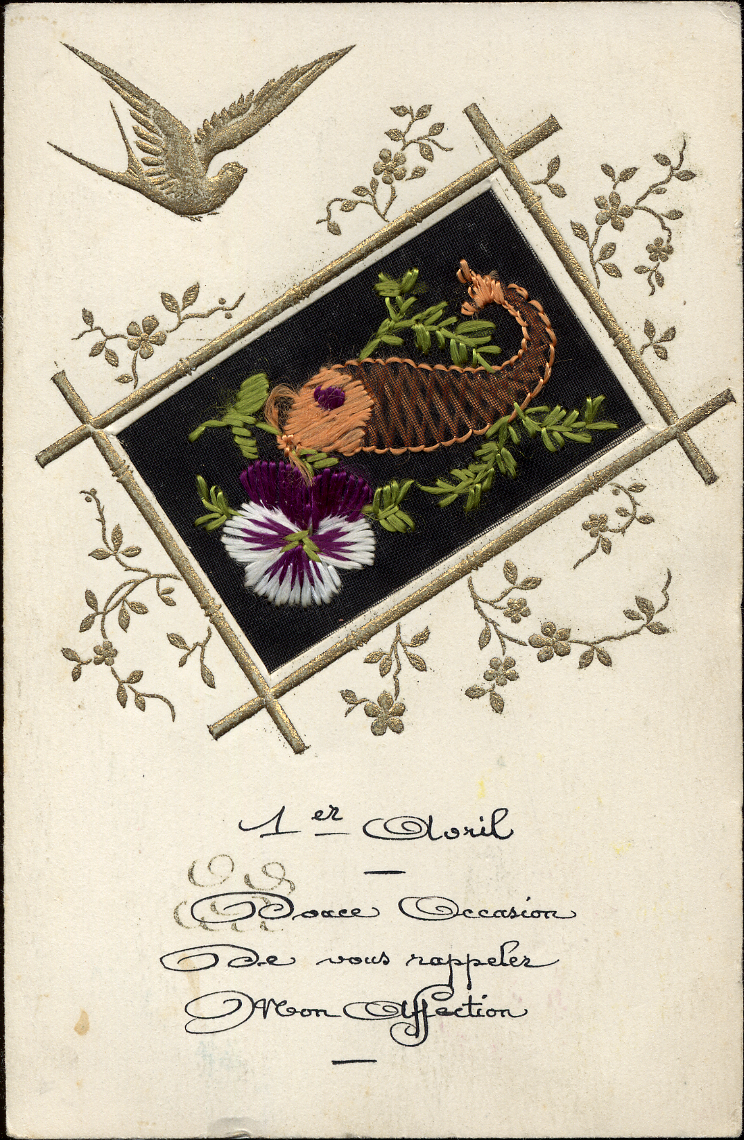 - This postcard has a fish and flower embroidered on a screened cutout. A gold bird is embossed above the embroidered picture, and gold flowers are embossed around it. Text at bottom center: French script, "1er Avril / douce occasion / de vous rappeler / mon affection." On reverse: handwritten message.