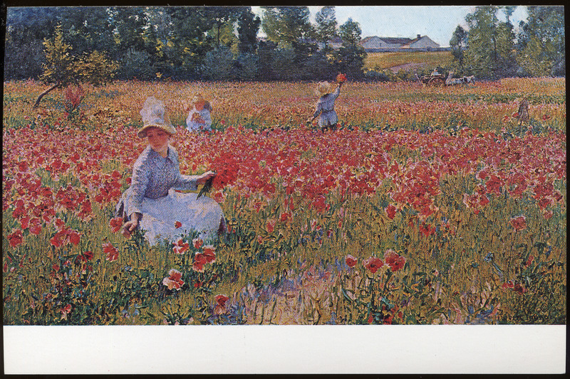 - This postcard is a color picture of a flower field with children picking flowers in it. On reverse: "Flanders Field/'Where Soldiers Sleep/And Poppies Grow'/by Robert W. Vonnoh/58" x 104" Oil. Painted 1914./The Butler Institute of American Art/524 Wick Avenue/Youngstown, Ohio 44502"; "Kolorvue by Artvue Post Card Co., 160 Fifth Ave., New York, N.Y. 10010".