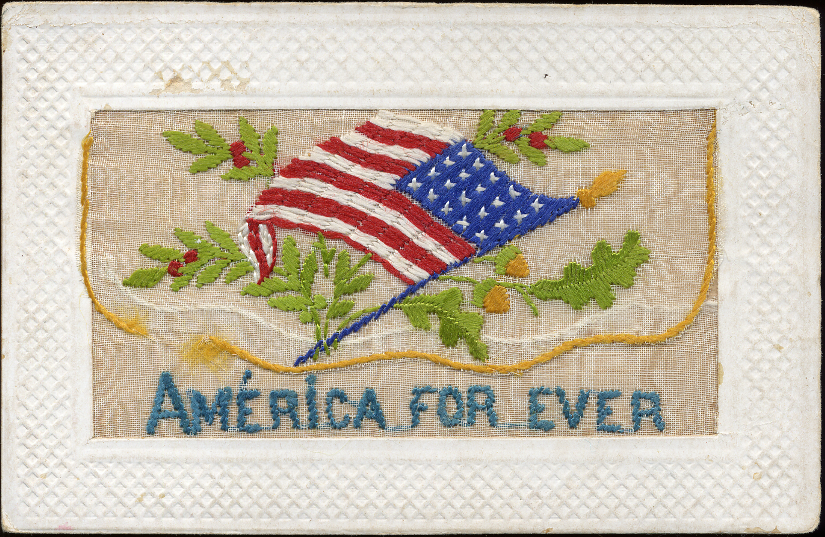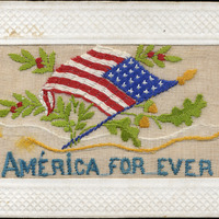 The phrase "America for ever" is embroidered beneath an embroidered American flag and green branches. On reverse: "Fabrication française, vise Paris".