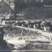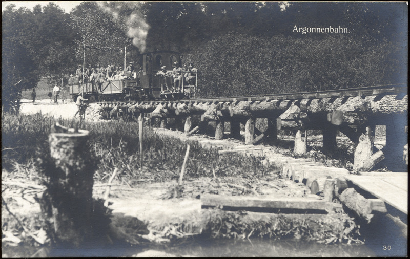 - This postcard is a black and white photo of soldiers in a small, crude train, crossing a bridge. Text at top right: "Argonnenbahn". On reverse: "Herausgegeben von der Feldbuchhandlung der 5. Armee."