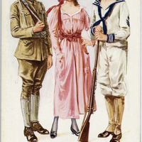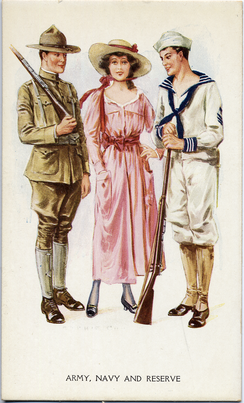 - This postcard is a colored drawing of a woman in a pink dress standing in between a soldier and a sailor. Text centered at bottom: "Army, Navy and Reserve". In faint letters: "[Arc]hie Gu[nn]" On reverse: "Illustrated Postal Card & Nov. Co. N. Y."
