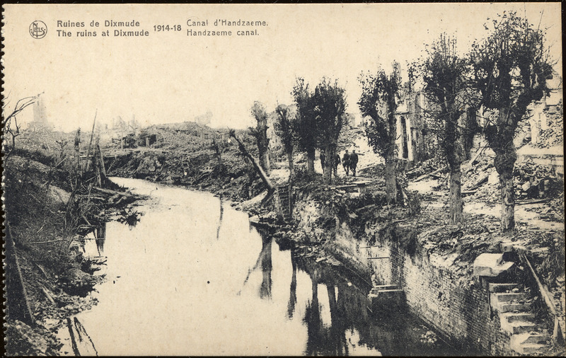 - This postcard is a black and white photo of a canal with ruins on both banks. Text at top left: "Ruines de Dixmude 1914-18 Canal d'Handzaeme."; "The ruins at Dixmude Handzaeme canal." On reverse: "Ern. Thill, Bruxelles."