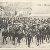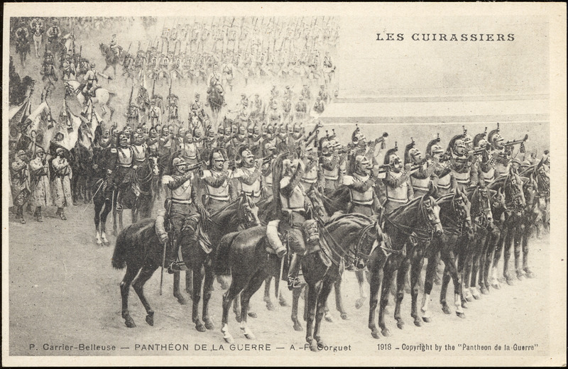 - This postcard is a black and white drawing of armored divisions on horseback. Top right text: "Les Cuirassiers". Text at bottom: "P. Carrier-Belleuse--Pantheon de la Guerre--A.-F. Gorguet 1918-Copyright by the 'Pantheon de la Guerre'". On reverse: "Edit. Art. H. Manuel. Paris".