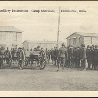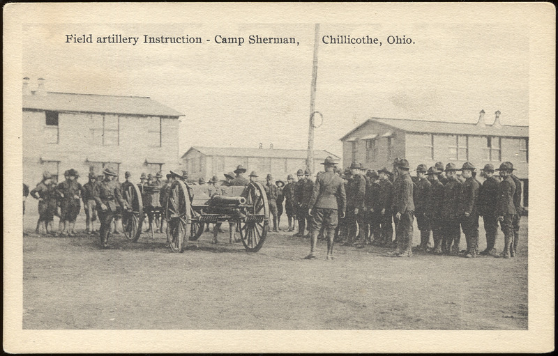 - This postcard is a black and white photo of cannon instruction to a group of soldiers. Text at top: "Field artillery instruction - Camp Sherman, Chillicothe, Ohio". On reverse: "Photo by The Corte-Scope Co., Cleveland, Ohio".