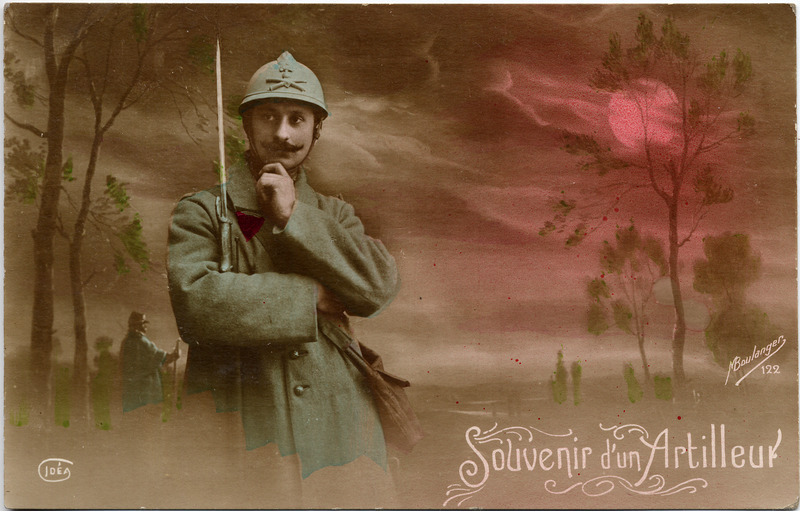 This postcard is a color-tinted, sepia-toned picture of two soldiers. One is in the background and the other is in the foreground. The soldier in front wears a blue-grey uniform and helmet. To his right is a tree with a pink sun behind it. Text at bottom right corner: "Souvenir d'un Artilleur" and "Boulanger 122." On reverse: "Fabrication Française - Vise Paris/J. Tailha[o]es - Levallois-Perret"; a handwritten message.