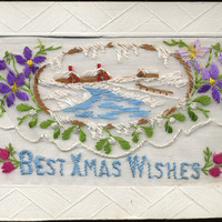 - This postcard has embroidered flowers, three cabins embroidered on the top and "Best Xmas Wishes" embroidered on the bottom. The front of the postcard also functions as an envelope, but has nothing inside. On reverse: "fabrication française"; handwritten message.