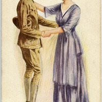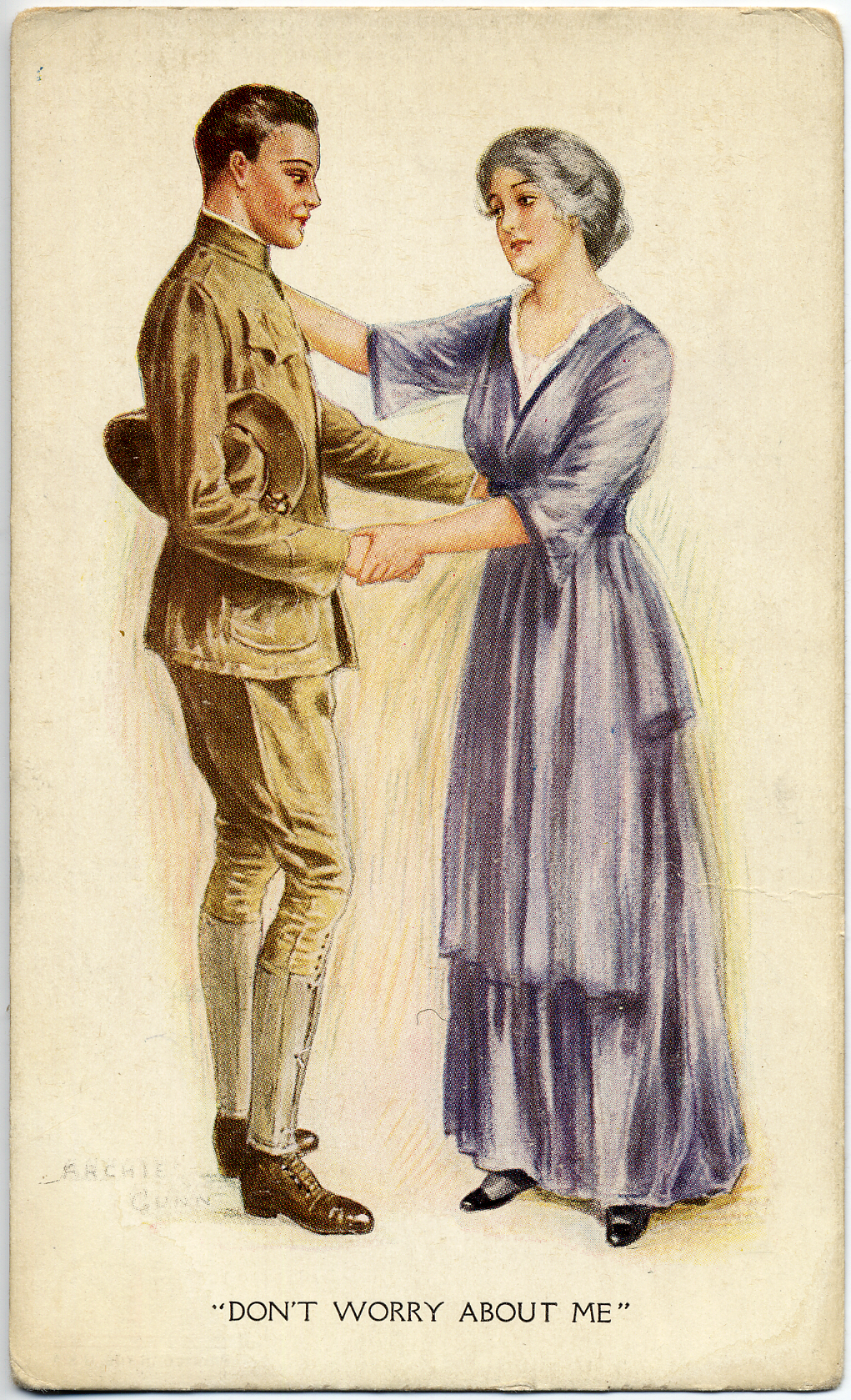 - This postcard is a color drawing of a soldier standing with a woman who has grey hair. Text at bottom center: "'Don't worry about me'". Text next to soldier's feet: "Archie Gunn". On reverse: "Illustrated Postal Card & Nov. Co. N.Y."; "Printed in the U.S.A."