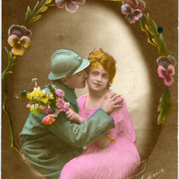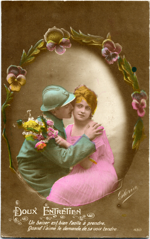 - This postcard is a color-tinted, sepia-toned picture of a soldier kissing a young woman on the cheek. Text at bottom left: "Doux Entretien". Text at bottom center: "Un baiser est bien facile à prendre/Quand l'aimé le demande de sa voix tendre." Text to right of the picture: "Gloria". At bottom right: "430". On reverse: handwritten message