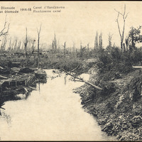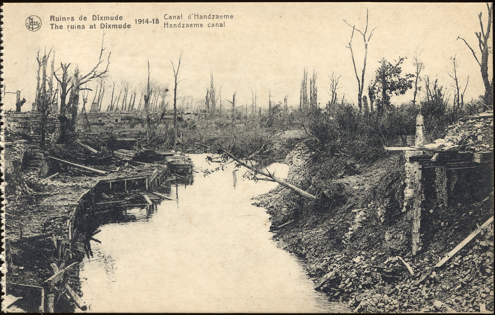 - This postcard is a black and white photo of a canal with ruins on both banks. Text at top left: "Ruines de Dixmude 1914-18 Canal d'Handzaeme."; "The ruins at Dixmude Handzaeme canal." On reverse: "Ern. Thill, Bruxelles."