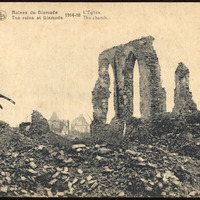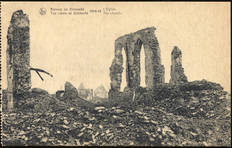 - This postcard is a black and white photo of the ruins of a church. Text at top left: "Ruines de Dixmude 1914-18 L'Eglise."; "The ruins at Dixmude The church." On reverse: "Ern. Thill, Bruxelles."
