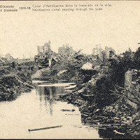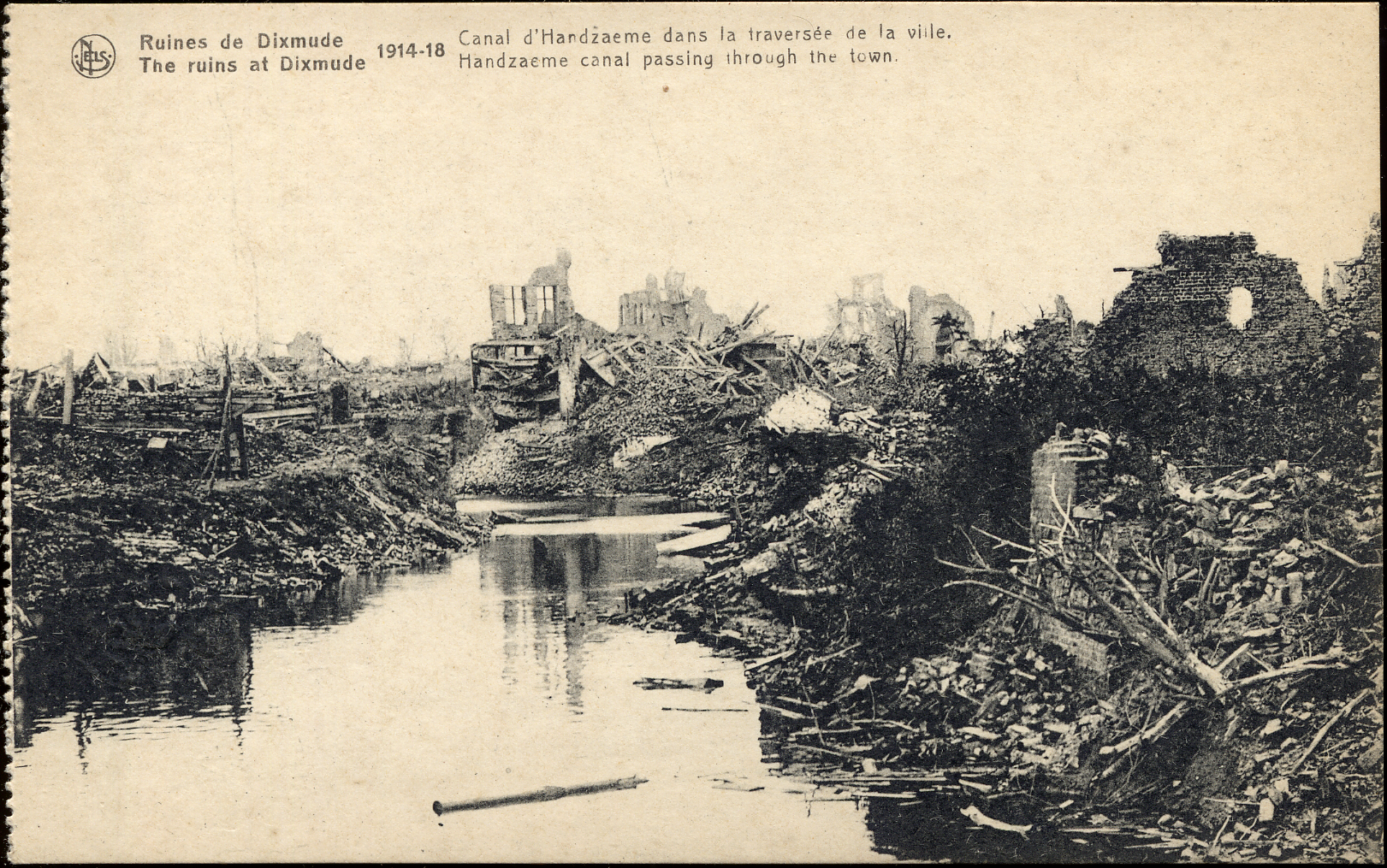 - This postcard is a black and white photo of a canal with ruins on both banks. Text at top left: "Ruines de Dixmude 1914-18 Canal d'Handzaeme dans la traversée de la ville."; "The ruins at Dixmude Handzaeme canal passing through the town." On reverse: "Ern. Thill, Bruxelles."