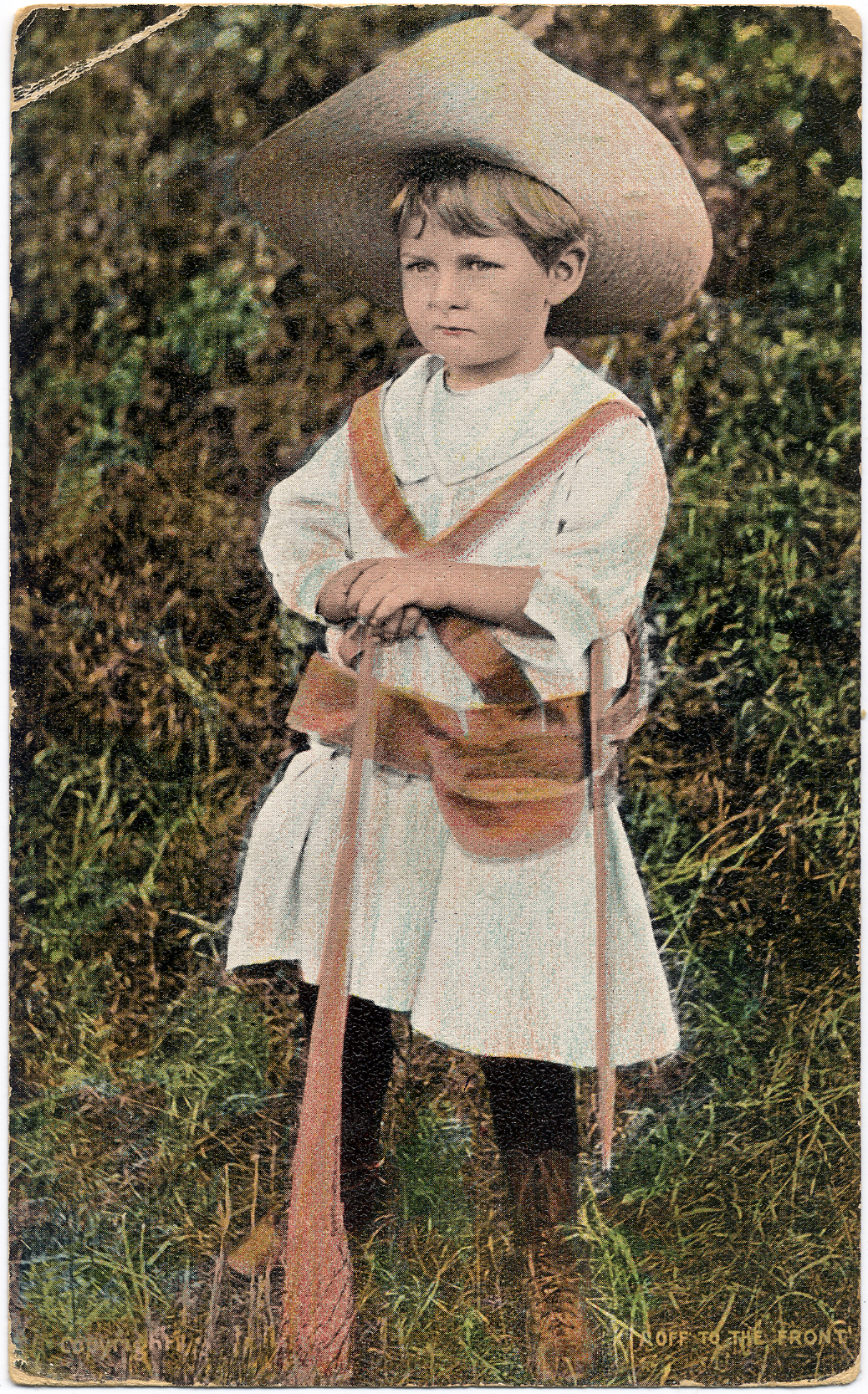- This postcard is a color picture of a young boy standing in the grass, wearing a hat and a shoulder harness with wooden weapons. Text at bottom right: "Off to the front". On reverse: a handwritten message.