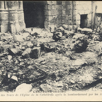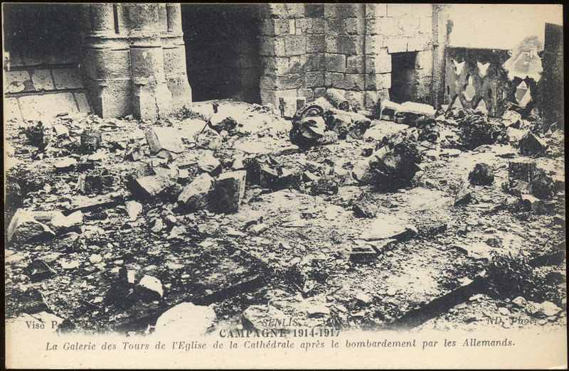 - This postcard is a black and white photo of cathedral ruins. Text centered at bottom: "Senlis", "Campagne 1914-1917" and "La Galerie des Tours de l'Eglise de la Cathédrale après le bombardement par les Allemands." Text at bottom left: "Visé Paris". Text at bottom right: "ND. Phot." On reverse: "Imp. Prot. Æurdein Et Cie, 52, Av. De Breteuil. - Paris."
