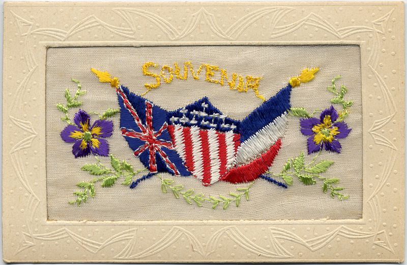 This postcard has two flowers and three flags embroidered on it, as well as "Souvenir" at the top. On reverse: "Made in France - Tarare".