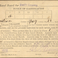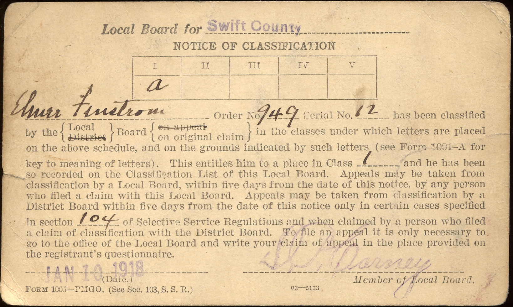 - This postcard is a notice of classification from the Local Board War Department for Swift County, Benson, Minnesota. It is dated January 10, 1918.