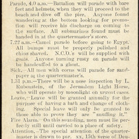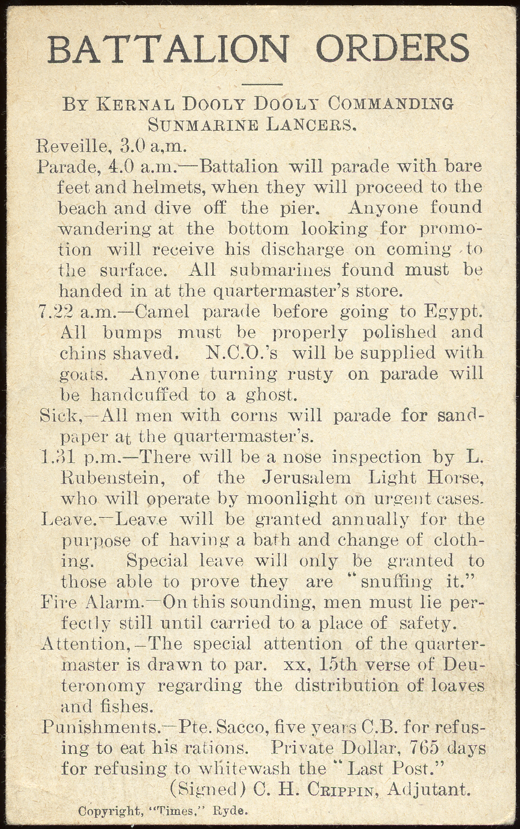 - This postcard mocks official battalion orders, listing out such activities as a barefoot parade, a camel parade, and a nose inspection. Text at top center: "Battalion Orders/By Kernal Dooly Dooly Commanding/Sunmarine Lancers." Text at bottom right: "(Signed) C.H. Crippin, Adjutant." Text at bottom left: "Copyright, 'Times,' Ryde." On reverse: blank.