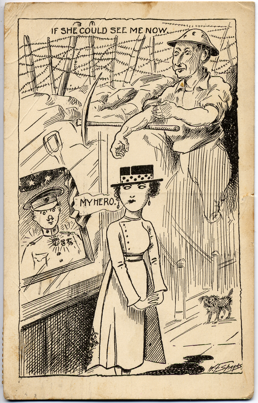 - This postcard is a black and white cartoon. At the top, a man with a pickax stands by a barbed wire fence. Text at top left: "If she could see me now." At the bottom is a woman looking at a portrait of a military man. Text beside woman: "My Hero." On reverse: "Copyright 1918 by M.V. Bixby, Plattsburgh, N.Y."; handwritten message; postage date of September 8, 1918.