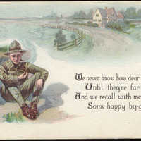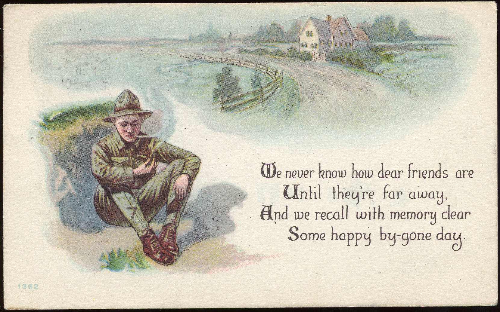 This postcard has a color illustration of a soldier sitting and smoking a pipe in the foreground. In the background is a rural road and a house. Text at bottom right: "We never know how dear friends are / Until they're far away, / And we recall with memory clear / Some happy by-gone day." On reverse: "© Illustrated Postal Card and Nov. Co. N.Y."; handwritten message; postage date of 1918.