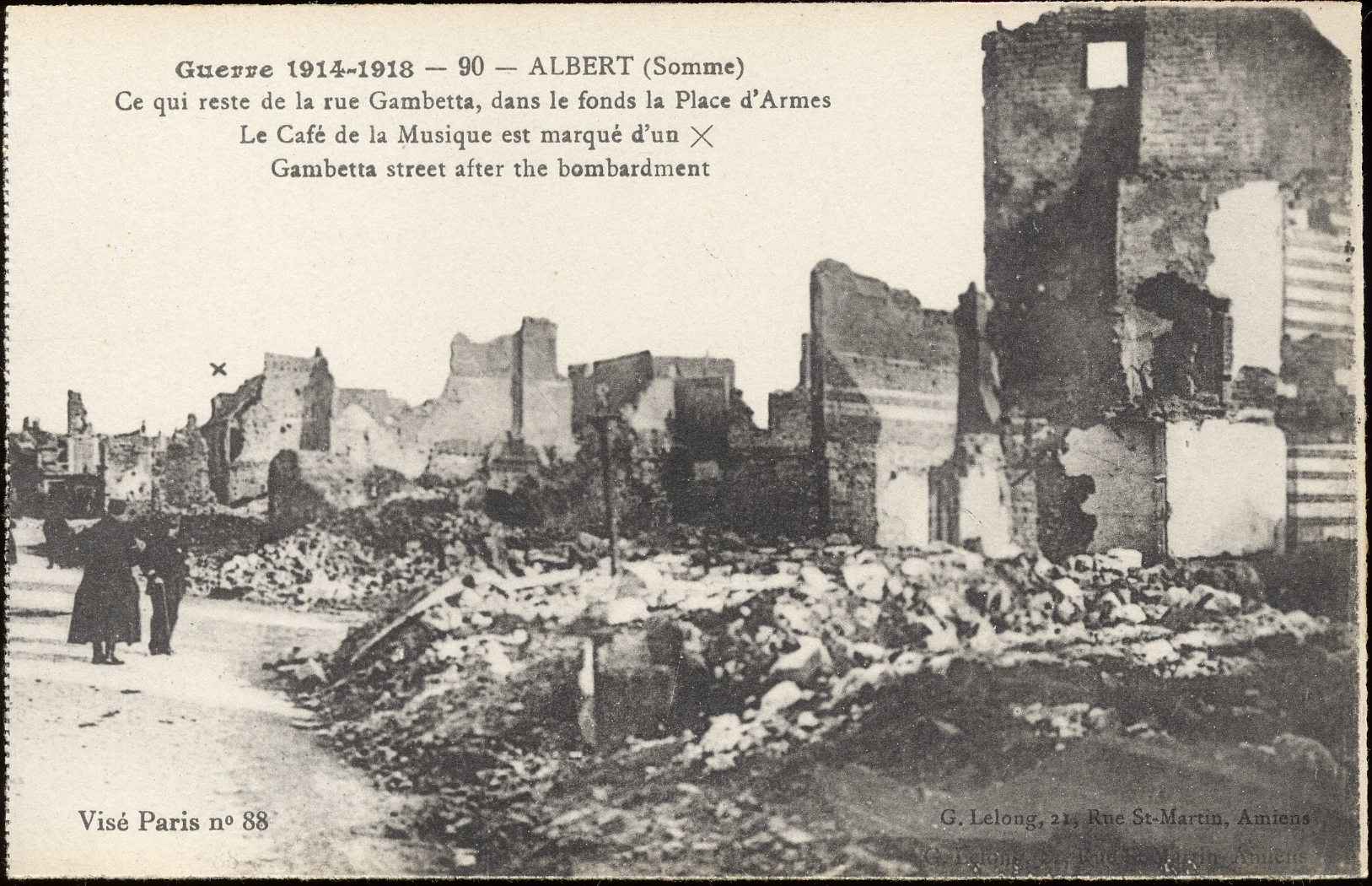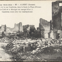 - This postcard is a black and white photo of ruins in a street. Text at top left: "Guerre 1914-1918--90--Albert (Somme)/Ce qui reste de la rue Gambetta, dans le fonds la Place d'Armes/Le Café de la Musique est marqué d'un/Gambetta street after the bombardment". Text at bottom left: "Visé Paris no 88". On reverse: "Imp. Catala Frères, Paris."