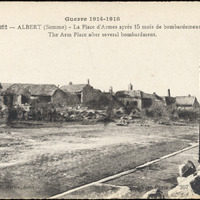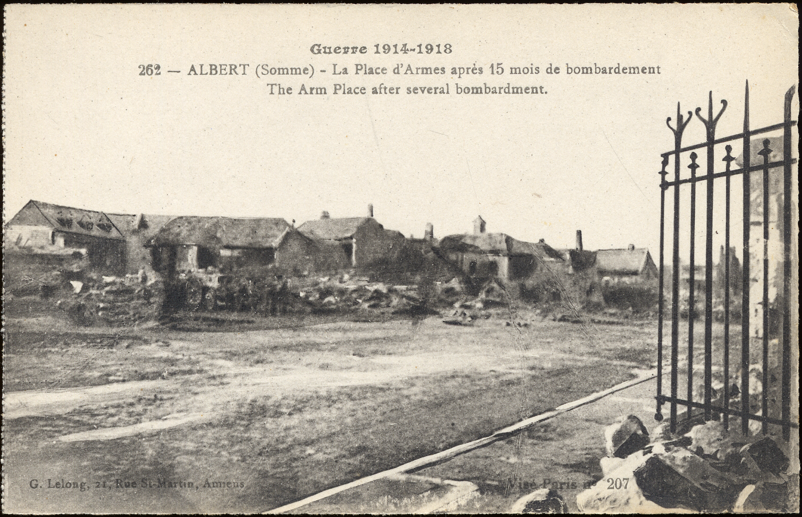- This postcard is a black and white photo ruined houses along a street. Text at top center: "Guerre 1914-1918/262--Albert (Somme) - La Place d'Armes après 15 mois de bombardement/The Arm Place after several bombardment." Text at bottom left: "G. Lelong, 21, Rue St-Martin, Amiens". Text at bottom right: "Visé Paris no 207". On reverse: "Imp. Catala Frères, Paris."