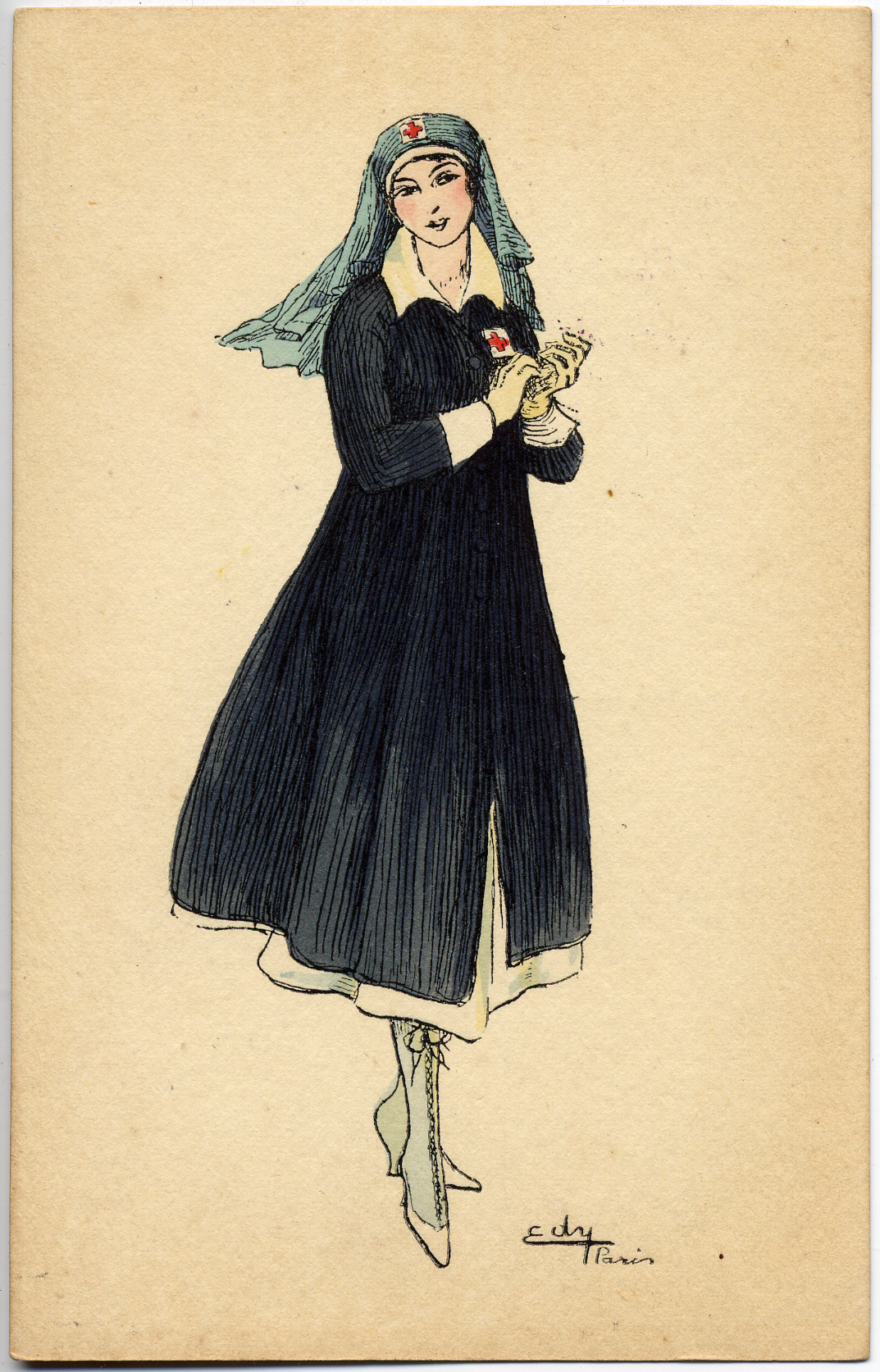 This postcard is a color drawing of a nurse/red cross worker. On reverse: "J. Picot, Imp. Edit., Paris"; handwritten message.