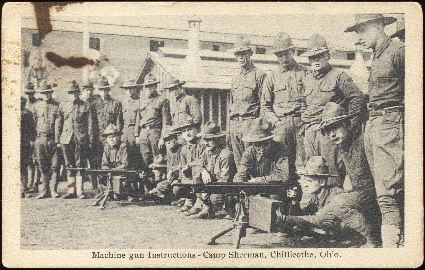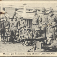 - This postcard is a black and white photo of soldiers receiving instructions on machine guns. Text at bottom center: "Machine gun Instructions-Camp Sherman, Chillicothe, Ohio." On reverse: "Photo by the Corte-Scope Co., Cleveland, Ohio."