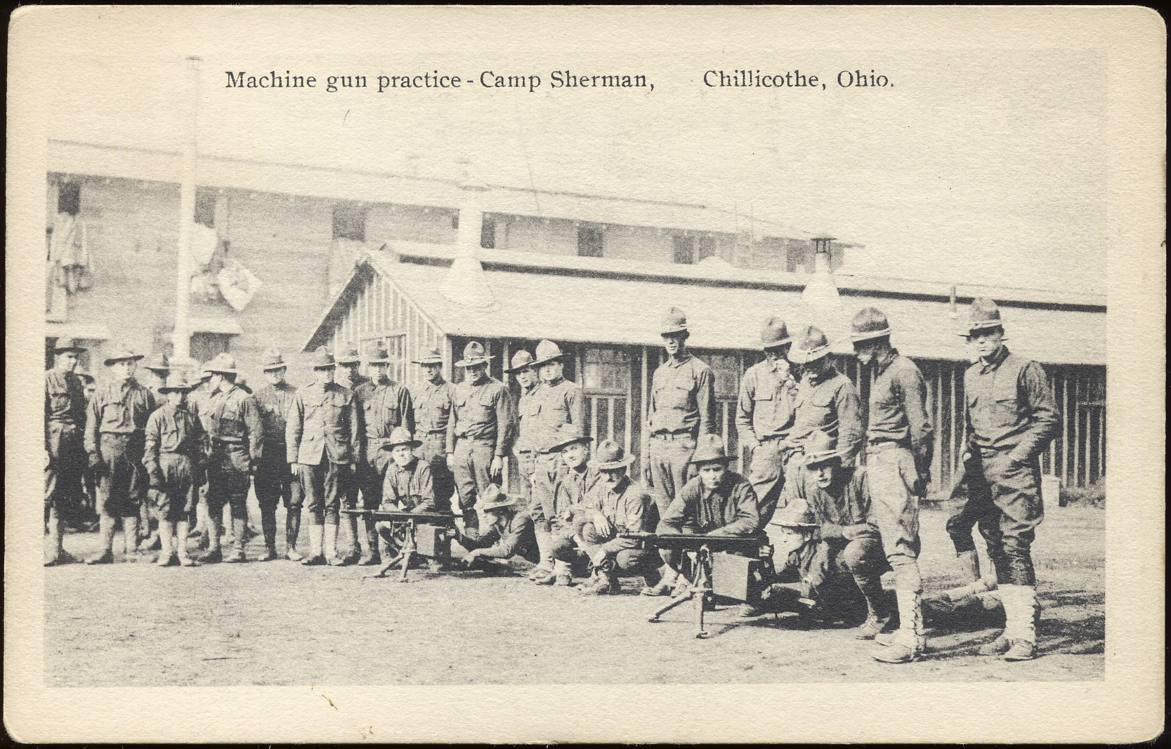 - This postcard is a black and white photo of soldiers with machine guns. Text at top center: "Machine gun practice-Camp Sherman, Chillicothe, Ohio." On reverse: "Photo by the Corte-Scope Co., Cleveland, Ohio."