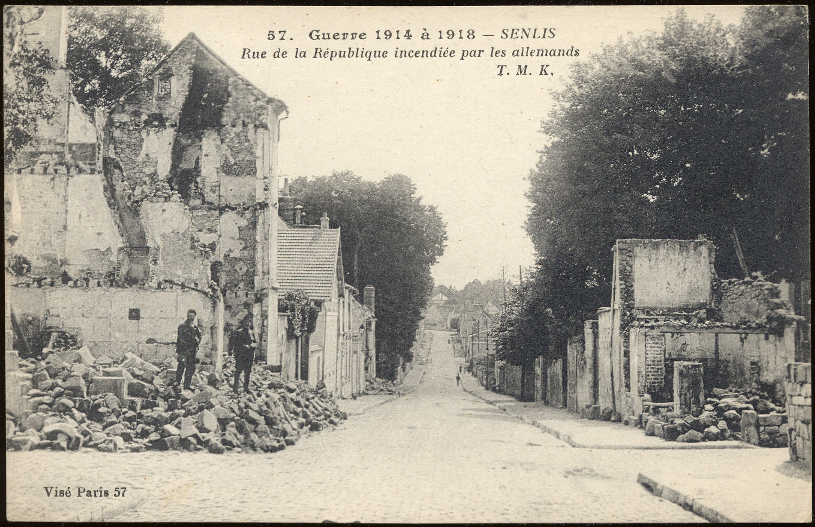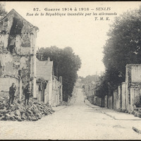 - This postcard is a black and white photo of a street with ruins on both sides. Two men stand on a pile of rubble. Text at top center: "Guerre 1914 à 1918 - Senlis/Rue de la République incendiée par les allemands/T. M. K." Text at bottom left: "Visé Paris 57". On reverse: "Timinsky, 104 Rue Lafayette Paris".