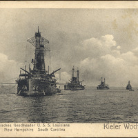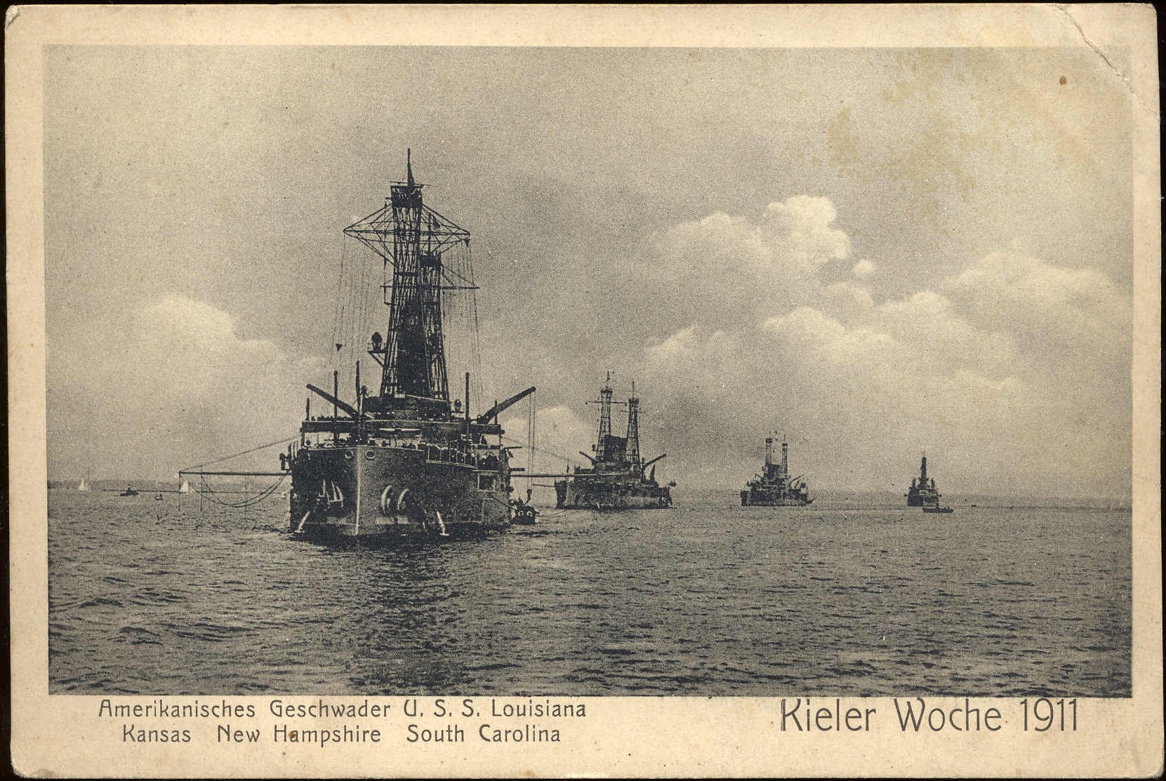 - This postcard is a black and white photo of four ships in the water. Text at bottom left: "Amerikanisches Geschwader U.S.S. Louisiana Kansas New Hampshire South Carolina". Text at bottom right: "Kieler Woche 1911". On reverse: "Verlag: Marinebazar, Kiel."