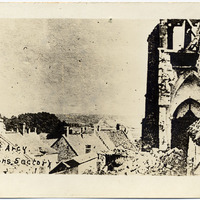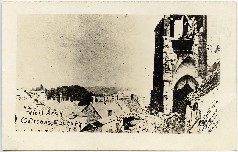 - This postcard is a black and white photo which gives a bird's eye view of some houses and other buildings. Text at bottom left: "Vicit Arcy (Soissons Sector)". Text at bottom right: "© 1919 Martinson Tiffany New York". On reverse: blank.