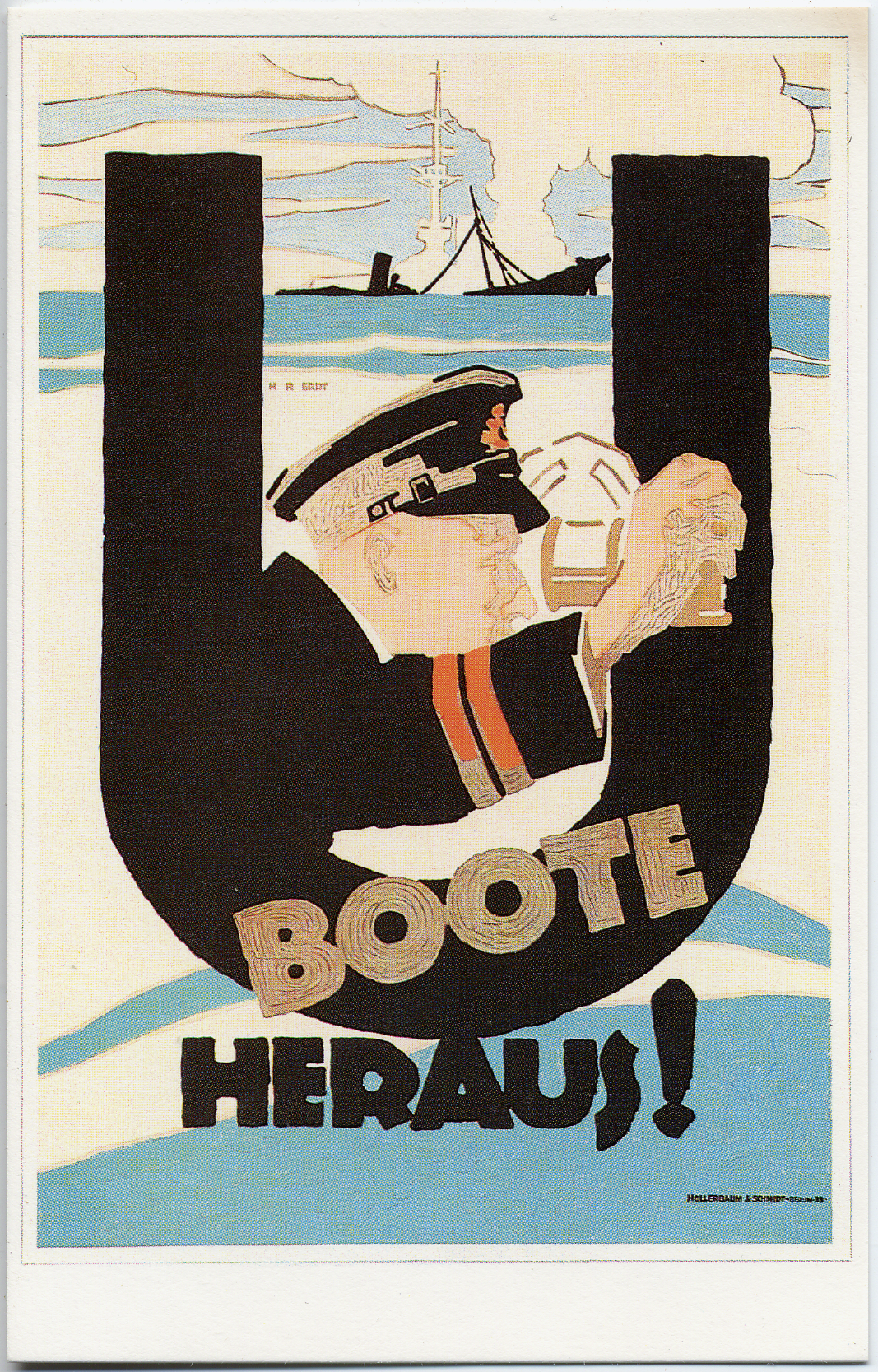 - This postcard is a color illustration of a naval officer inside a large "U", looking through a periscope. Text at bottom: "Boote Heraus!". Text at bottom right: "Hollerbaum and Schmidt--Berlin". On reverse: "Dalkeith Classic Poster P82"; "Hans Rudi Erdt, Germany. Translation: 'U-Boats Out'".