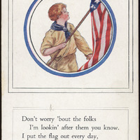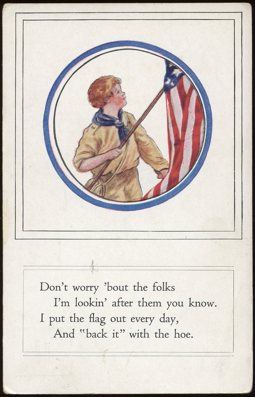 - This postcard is a color illustration of a young boy in uniform holding an American flag. Text at bottom center: "Don't worry 'bout the folks/I'm lookin' after them you know./I put the flag out every day,/And 'back it' with the hoe." On reverse: "Pub. By Christy Col Print. Eng Inc. Rochester N.Y. Series No 1".