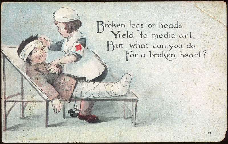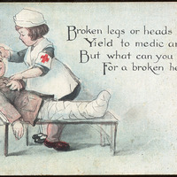 - This postcard has a color drawing of a nurse aiding a soldier as he lies on a cot. He has bandages on his head and his legs. The two figures are children. Text at right: "Broken legs or heads/Yield to medic art,/But what can you do/For a broken heart?" On reverse: "Series 571 War nurses 12 des."; handwritten message.