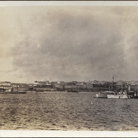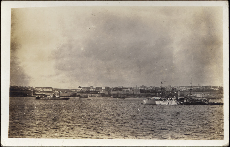 This postcard is a black and white photo of a ship harbor. On reverse: blank.