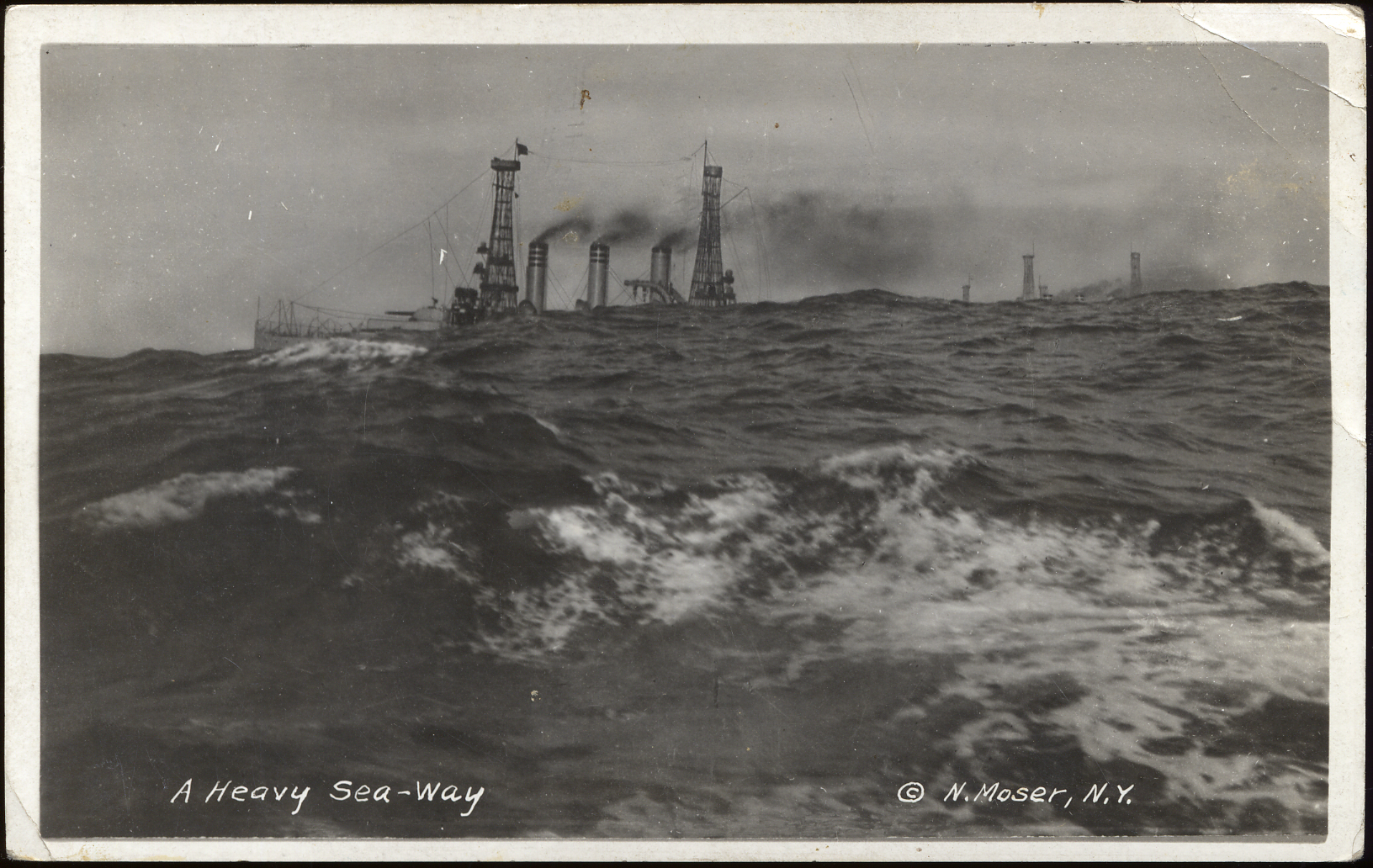 - This postcard is a black and white photo of two ships, partially obscured by waves. Text at bottom left: "A Heavy Sea-Way". Text at bottom right: "© N. Moser, N.Y." On reverse: blank.