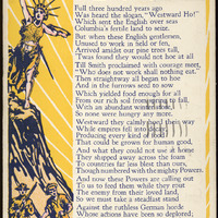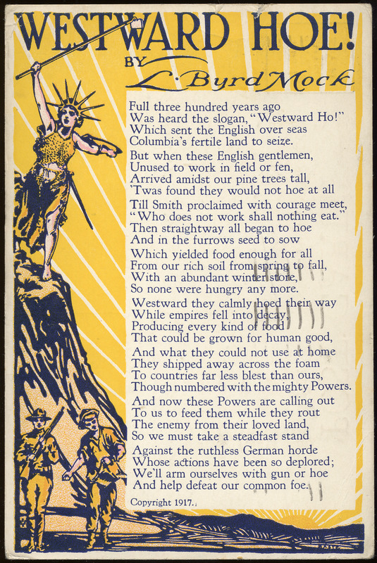 - This postcard has a poem about fighting the Germans by L. Byrd Mock entitled "Westward Hoe!" Beside the poem is a drawing of the statue of liberty pointing two soldiers where to go. Text beneath poem: "Copyright 1917." On reverse: handwritten message.