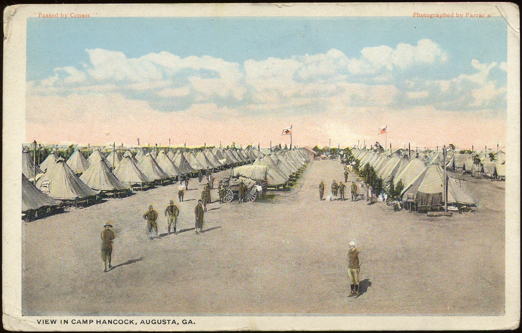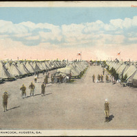 - This postcard is a color illustration of a campground. Printed at top left: "Passed by Censor"; at top right: "Photographed by Farrar's". Text at bottom left: "View in Camp Hancock, Augusta, GA." On reverse: "C.T. American Art".