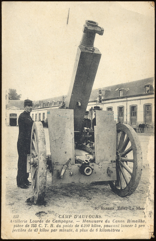 This postcard is a black and white photo of a soldier standing beside a cannon which is pointing upward. Text at bottom right: "R. Barbier, Edit., Le Mans". Text at bottom center: "Camp D'Auvours. Artillerie Lourde de Campagne. -- Manœuvre du Canon Rimailho, pièce de 155 C.T.R. du poids de 4.200 kilos, pouvant lancer 5 projectiles de 43 kilos par minute, à plus de 6 kilomètres." On reverse: "Imp. Phot. Paris"; handwritten message.