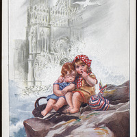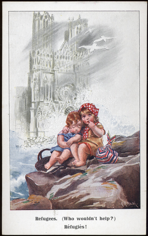 - This postcard is a color illustration of two small children huddled together on a rocky bank. In the background is a large cathedral. Text at bottom center: "Refugees. (Who wouldn't help?) Réfugiés!" On reverse: "Inter-Art Co., Red Lion Square, London, W.C. 'Two-o-nine' Series. No. 211. British Manufacture."