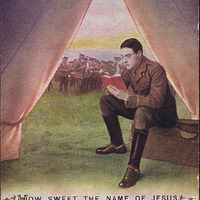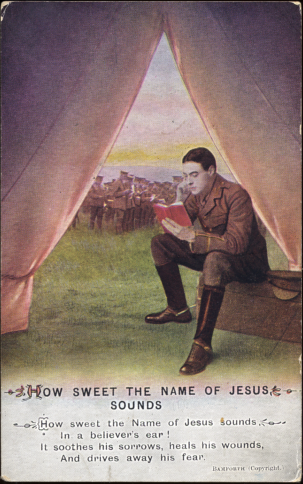 This postcard has a color illustration of a soldier sitting at the opening of a tent and reading a book. Text at bottom center: "How Sweet the Name of Jesus Sounds / How sweet the Name of Jesus sounds / In a believer's ear! / It soothes his sorrows, heals his wounds, / And drives away his fear." Text at bottom right: "Bamforth (Copyright.)" On reverse: "Bamforth & Co., 96 Warren St., New York"; handwritten message.