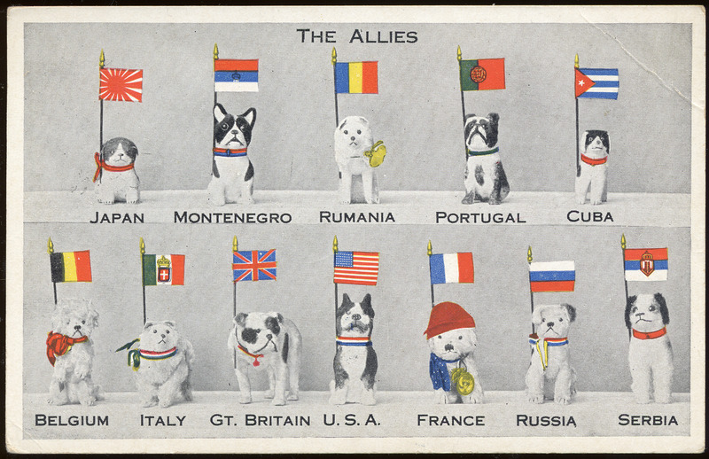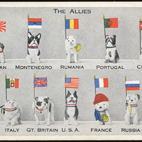 - This postcard has pictures of various stuffed animals with flags, each representing a different country. The countries are: Japan, Montenegro, Rumania, Portugal, Cuba, Belgium, Italy, Great Britain, U.S.A., France, Russia, and Serbia. On reverse: "Proceeds from these cards go to the relief of the Allies"; "Allies' Special Aid, 19 East 37th Street, New York City"; "C--1917 Allies' Special Aid".