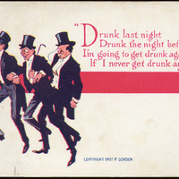 - This postcard has a color cartoon drawing of three men in tuxedoes. Text at top right: "'Drunk last night/Drunk the night before/I'm going to get drunk again tonight/If I never get drunk any more'". Text at bottom: "Copyright 1907 P. Gordon". On reverse: blank.