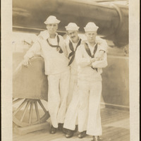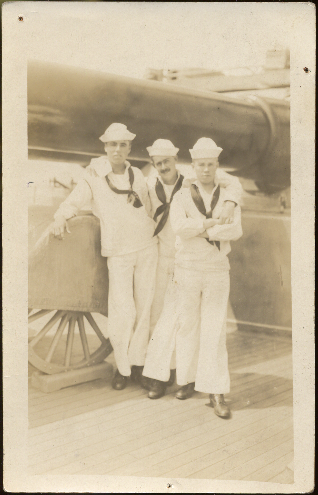 This postcard is a black and white photo of three sailors posing for a picture in white uniforms. On reverse: blank.