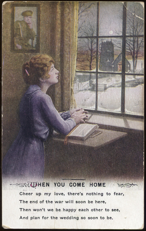 - This postcard has a color illustration of a woman gazing through a window. Above her is a portrait of a soldier. Beneath the picture is a short poem entitled "When You Come Home". It says to be cheerful, for a wedding will occur soon after the war ends. On reverse: handwritten message; "Bamforth and Co., 96 Warren St., New York".