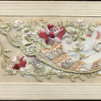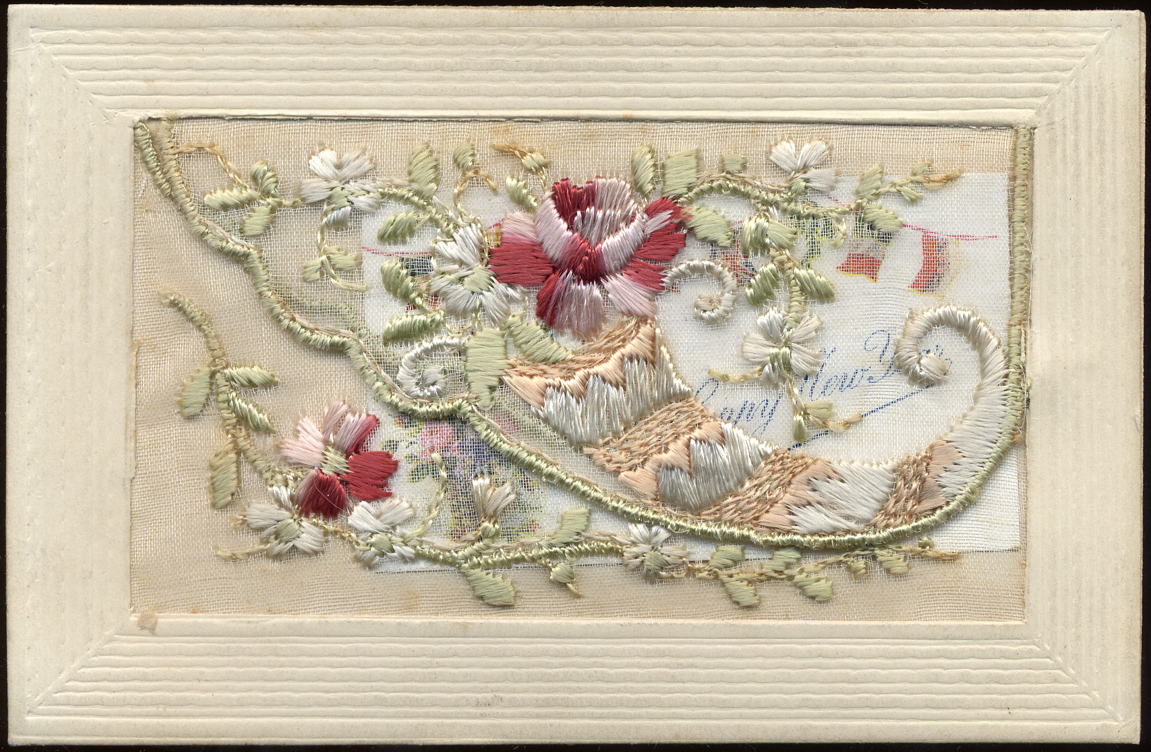 - This postcard has an embroidered cornucopia on the front. The postcard also functions as an envelope with a small card inside. The card has a picture of flowers and flags on it with the words "A Happy New Year". On reverse: handwritten message; "Fabrication Française".