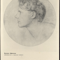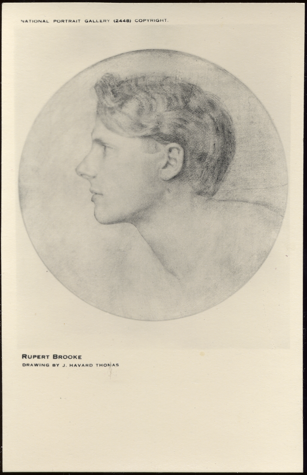 This postcard has a black and white drawing of a man's profile. Text at top left: "National Portrait Gallery (2448) Copyright." Text at bottom left of picture: "Rupert Brooke"; "Drawing by J. Harvard Thomas". On reverse: a short bio by "Edward Marsh." on Rupert Brooke, who was a poet and British soldier (1887-1915); "Printed for the National Portrait Gallery, London, by B. Matthews (Photo Printers) Ltd., Bradford, England."